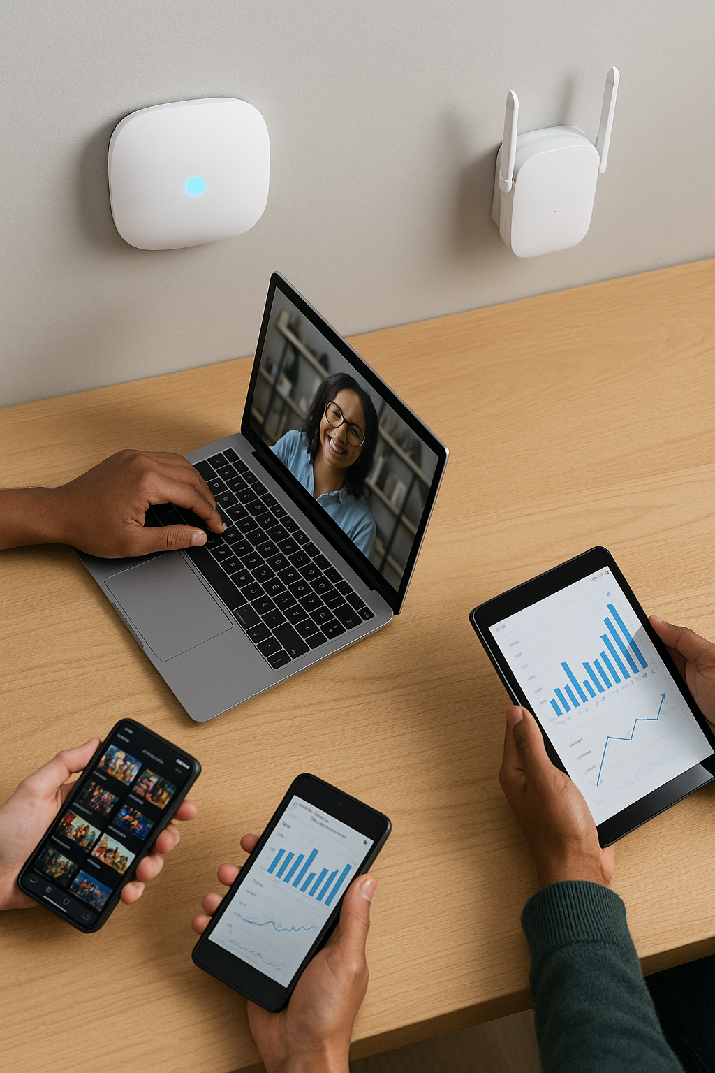 Access points and extenders ensure stronger bandwidth performance, even when multiple users are streaming, conferencing, or downloading files simultaneously.